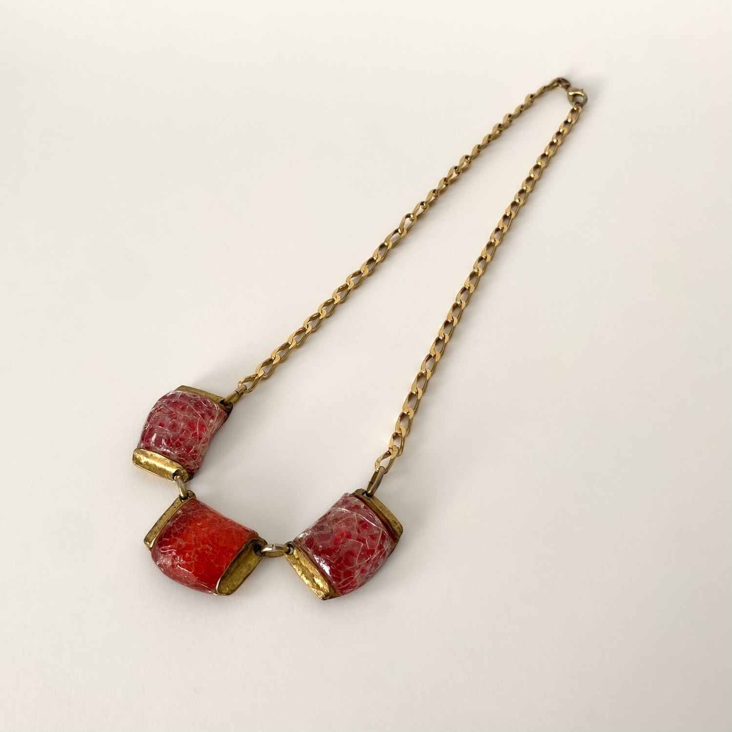 Collier vintage Isaky Paris années 80 • Résine craquelée rouge et Métal doré